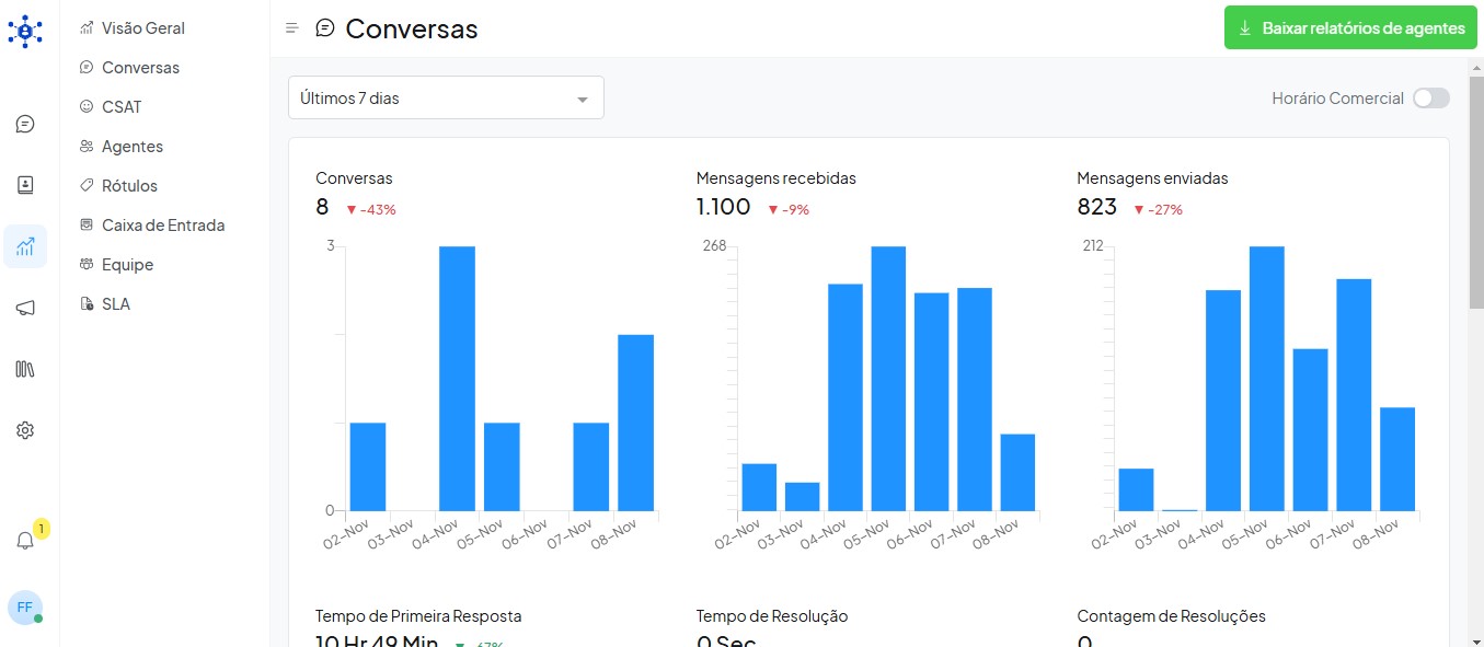 A plataforma oferece relatórios e análises detalhadas sobre o desempenho do atendimento, o tempo médio de resposta, as interações mais frequentes e as tendências de engajamento.